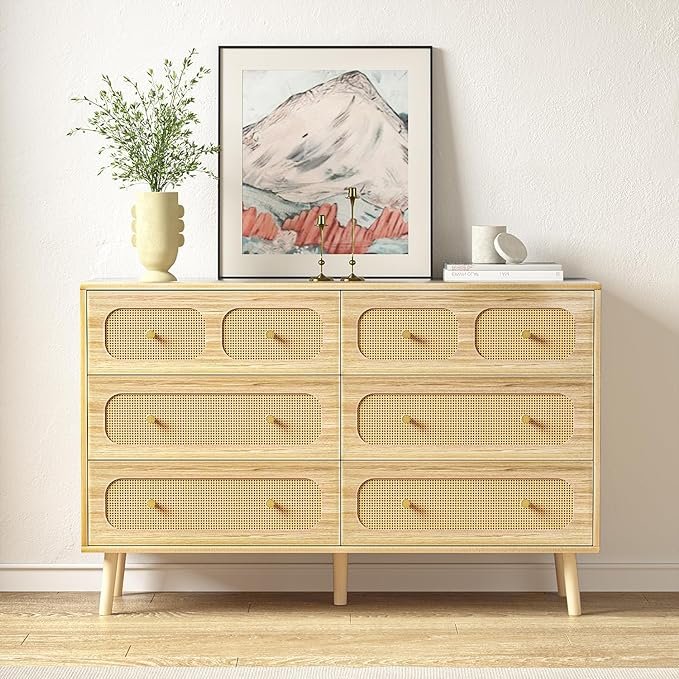 - 【PRACTICAL 6 DRAWER DRESSER】 Let the glamour of mid-century design enhance your living space. Adorned with woven rattan, slanted legs and gold knobs, this 6-drawer dresser is a stylish addition to your home. Whether on its own or paired with other HOUROM pieces, it brings a hint of elegance.